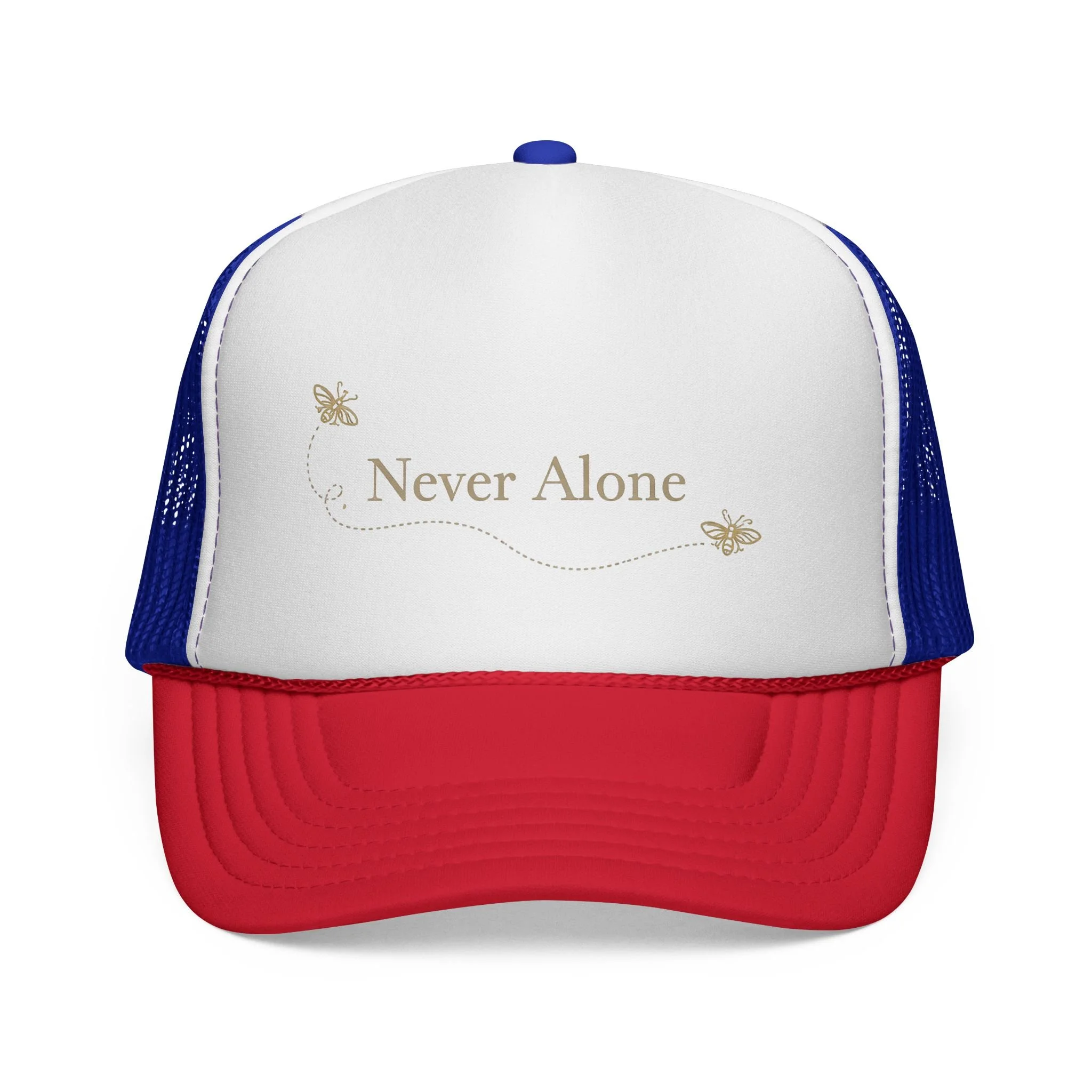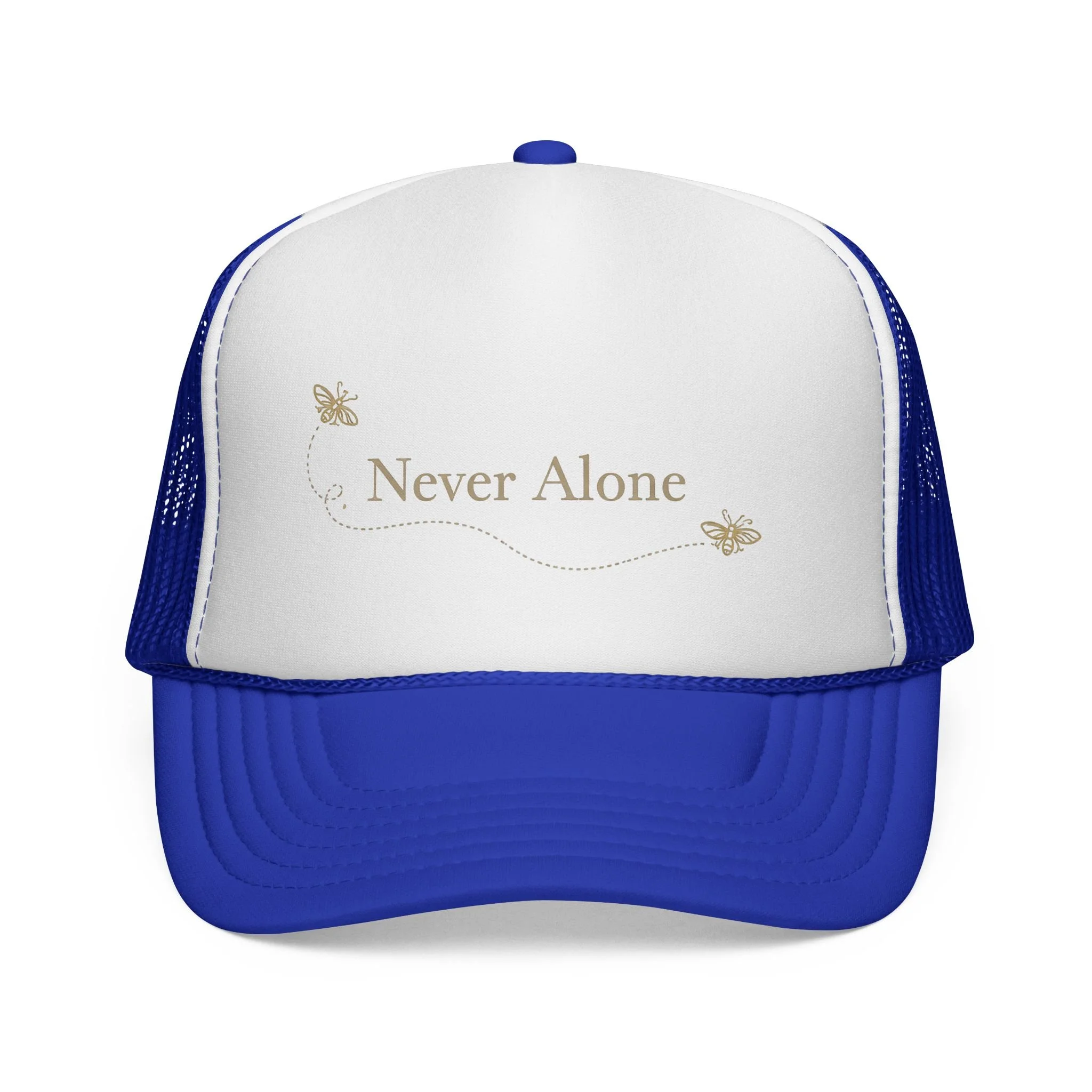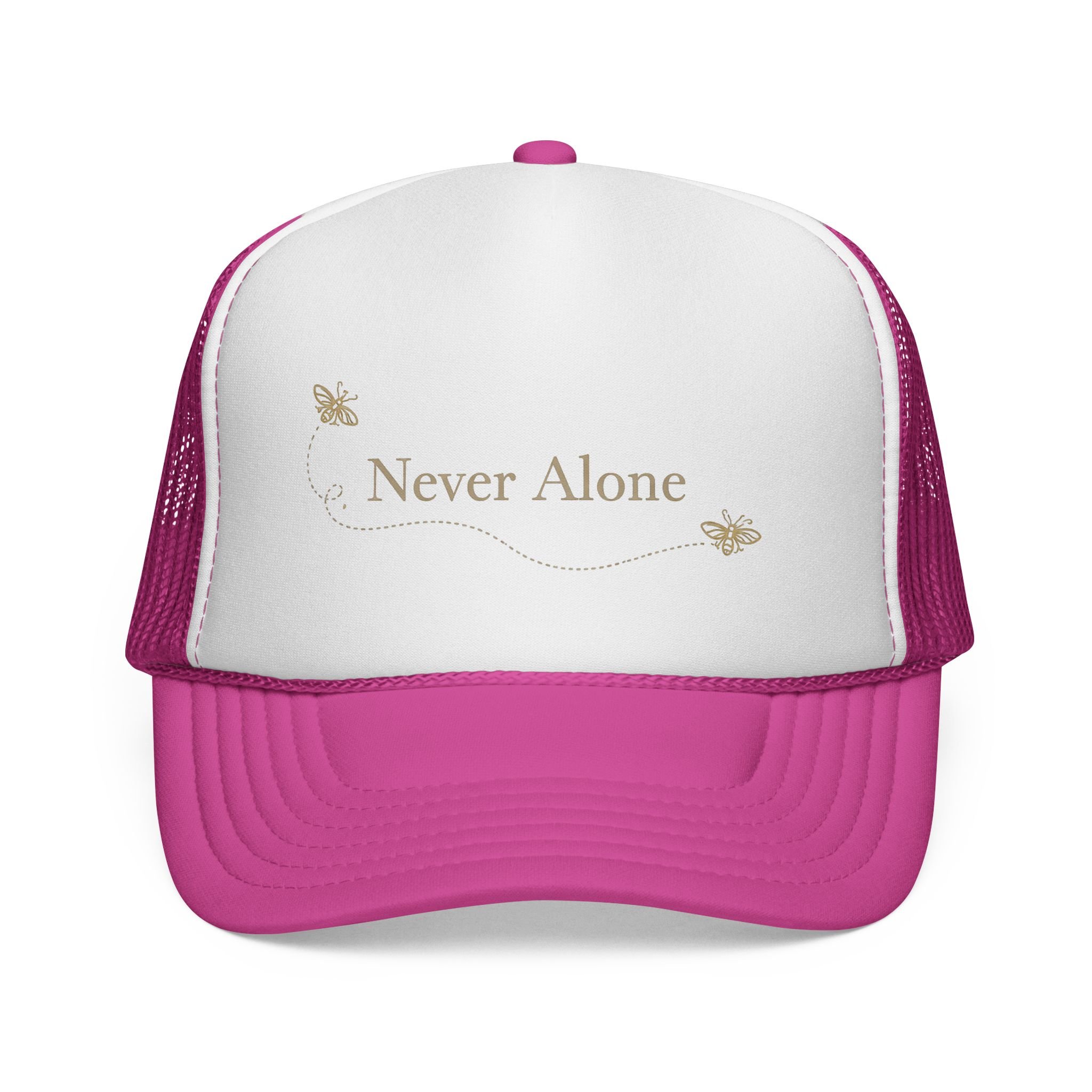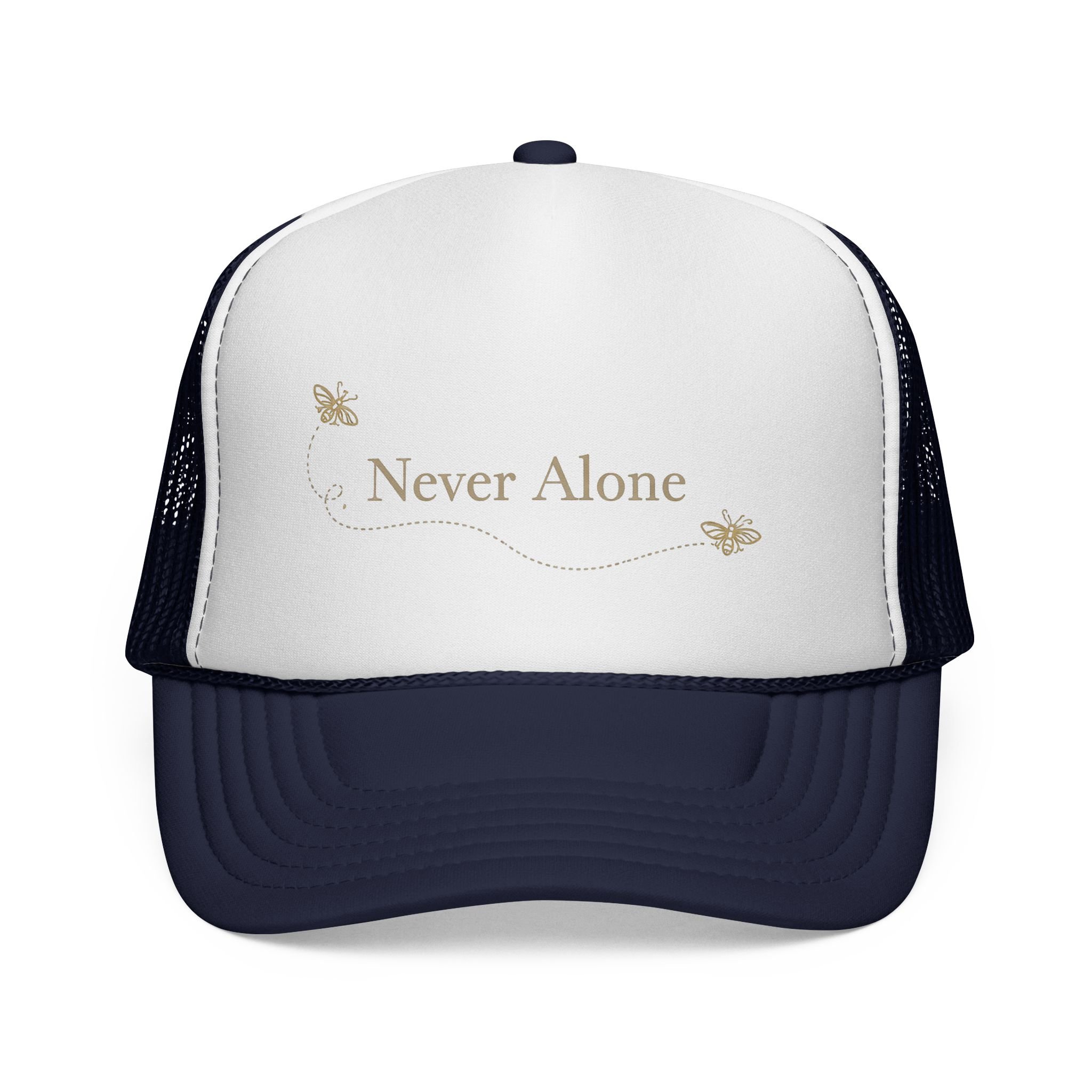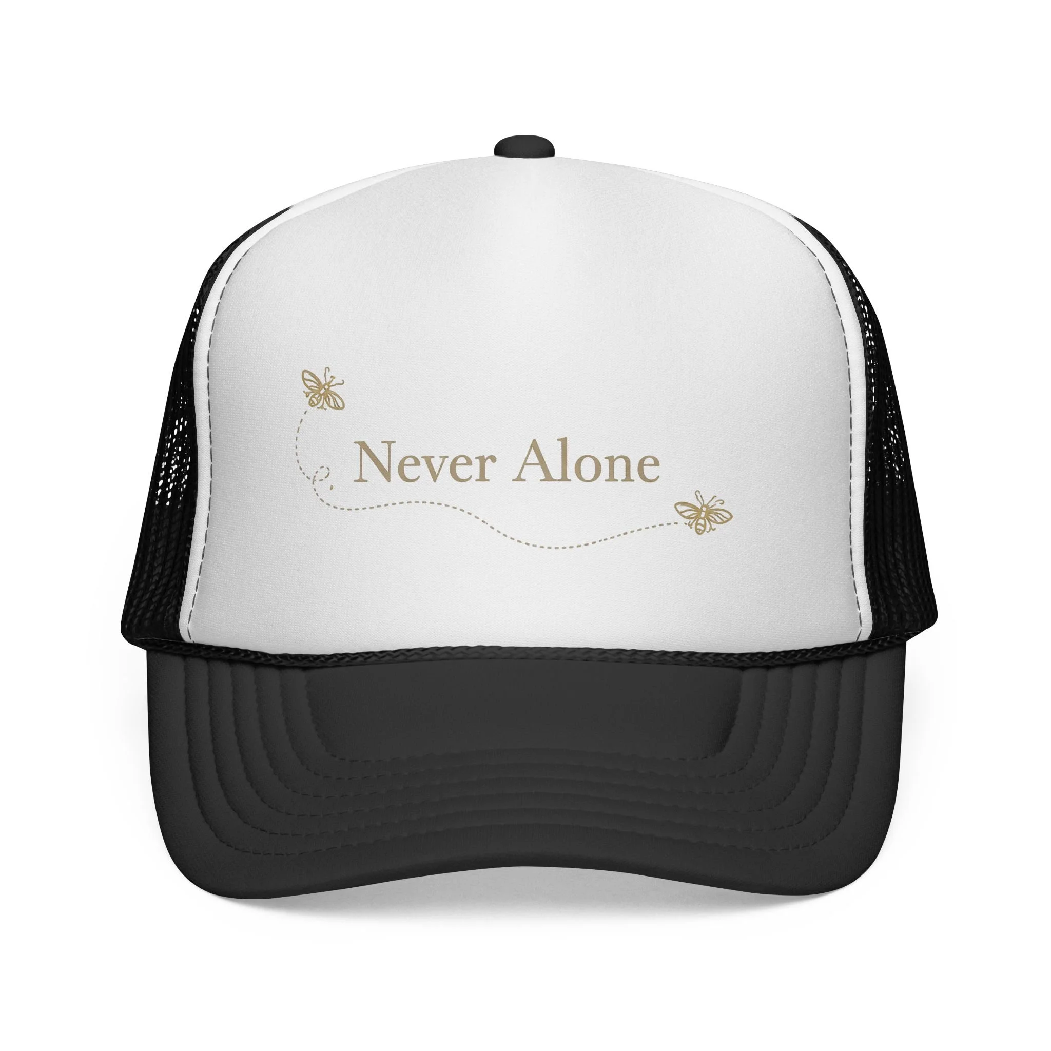 Lightweight trucker cap with a soft foam front and breathable mesh back, embroidered with a gentle “Never Alone” script and two small butterflies. The curved visor and six-row stitching give it a classic silhouette, while the adjustable snap closure ensures a comfortable fit for most adults. Subtle, warm tones keep the design understated—easy to wear on quiet mornings, at support meetups, or while taking a reflective walk. This cap settles into daily life: a quiet reminder of company during lonely hours, paired with denim jackets, cozy sweaters, or morning coffee runs.